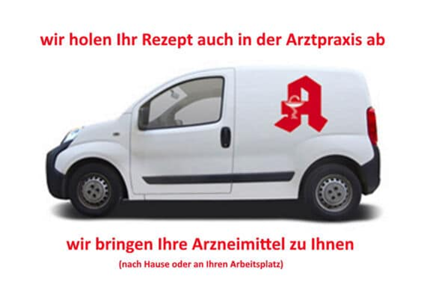 Nutzen Sie unseren Botendienst ! Wir holen Ihr Rezept beim Arzt ab und bringen Ihnen die benötigten Arzneimittel nach Hause oder an Ihre Arbeitsstelle.